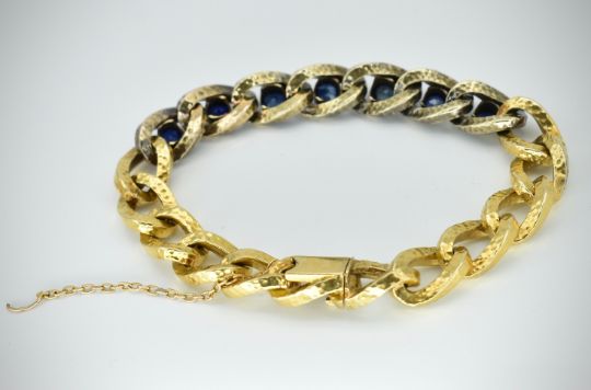 A French sapphire and diamond curb chain bracelet. The bracelet having gold and lighter gold planished curb links the central face set with rose cut diamonds and round mixed cut sapphires completed with concealed clasp and safety chain (safety chain link in need of repair). Sapphires approx 3.9mm x 3.9mm x 2.9mm. Measures 18cms. Weight 24.9g.
