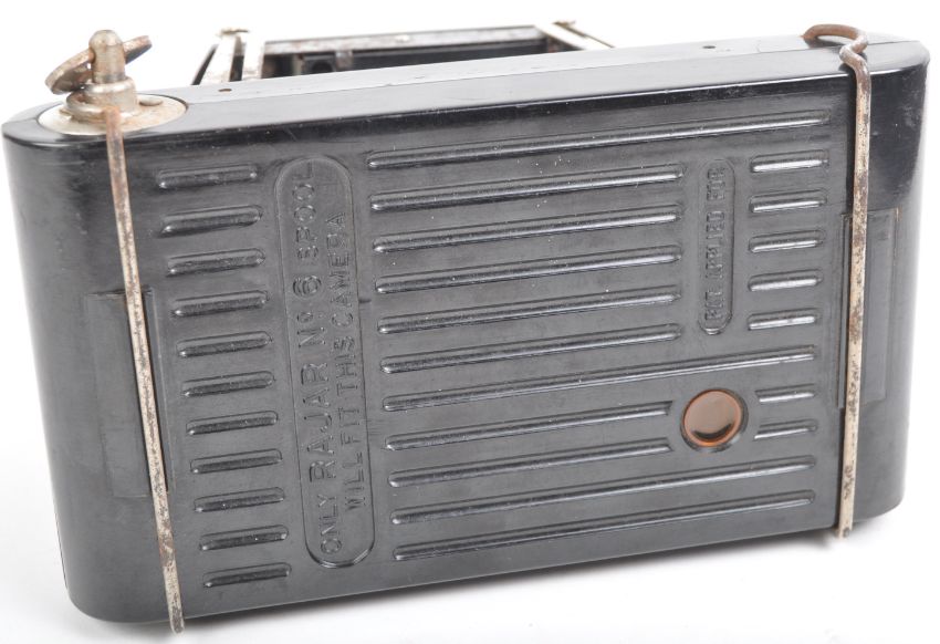 Of WWII Second World War Interest - an 'escape and evade' British SOE type 1930s Rajar No.6 folding bellows camera, with hidden escape items in the rear compartment, to include; a miniature brass 'escape' compass, various French coins, and a folded tissue paper map. Likely once on display. Such items were known to be smuggled by the British Government to stranded RAF Airmen or soldiers in German occupied territory / POW camps.