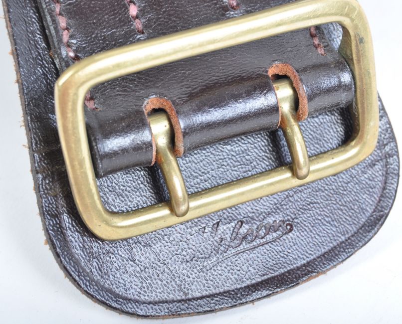 A 20th century post-WWII Second World War British Army Sam Browne leather uniform belt, complete with bayonet frog. Generally in excellent (likely unused) condition. ' Sam Browne No.1 Size 3 ' stamped to inner surface.