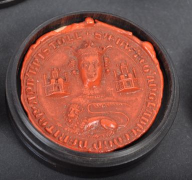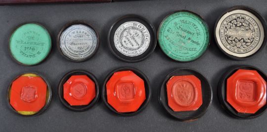 A large and impressive collection of x68 antique 18th and 19th Century hard wax seal impressions covering Napoleonic War Era, Victorian and Edwardian eras and others. Examples to include seals for Ernle Warriner High Sheriff of Wiltshire 1825, Borough of Chelmsford common seal 1889, many family name / house crests, Queen Victoria Acts of Parliament seals, a Bristol seal for Edward I, a seal with a note to the lid that reads ' This impression is from a seal taken by and Officer of the 11th Hussars from Prince Menschikoff's Carriage, which fell into the hand of the British Army after the Battle of the Alma Sept. 20th 1854 and many others. Makers include Culleton Heraldic Artrist & Engraver of 92, Picadilly London, Moring Heraldic Artist & Engraver of High Holborn London, Silvester Seal Engravers of 27 Strand London and others. The collection largely housed in mahogany circular seal boxes.