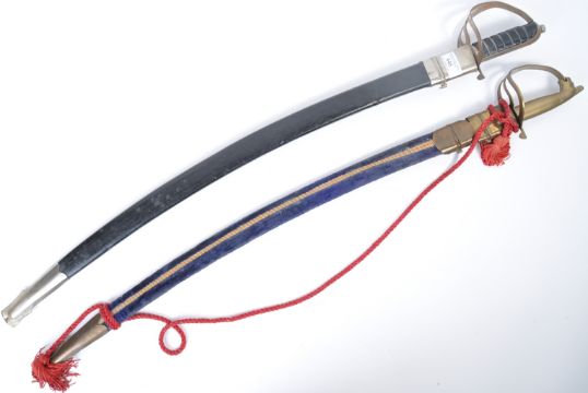 Two early 20th Century Indian cavalry swords, x1 having leather and wire grip with pierced white metal basket guard and black leatherette scabbard and the other having nut to the pommel with tiger head and a brass half basket guard. Both having long curved blades etched with scrolling leaves. Measuring approx 98cm