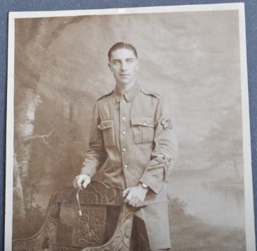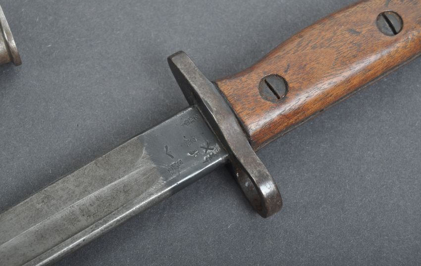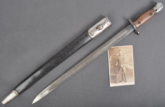 Lance Corporal William Albert Warren of the 2/4th Battalion, Devonshire Regiment - Warren's original 1907 pattern Wilkinson made rifle bayonet. Regimentally marked to the pommel ' T 4DVN 420 ' (for Territorial 1/4th Battalion Devonshire Regiment). The bayonet of typical form with hooked pommel, carved walnut grips, hooped quillon, the ricasso marked Wilkinson, and dated 1907 with GR cipher. Other official stampings to other side. Housed in its original leather and steel scabbard. Generally in excellent original used condition. Supplied with a period picture postcard photograph of Warren in uniform, taken at Lyme Regis. Rare to see a bayonet with such provenance. William Albert Warren was born in Minehead, and Baptised on 7th November 1896. Son of William Frederick and Annie Warren. In 1911 he was residing with his parents at The Assembly Rooms, Lyme Regis, Dorset. During WW1 he served with the 2/4th Devonshire Regiment and later with the 4th Wiltshire Regiment. He married Ethel M. Mitchell in 1923 at Lyme Regis.