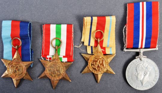 A WWII Second World War medal group awarded to one 4209127 Private Leonard Lewis of the Army Air Corps. Lewis killed in action, 1944. The posthumous medal group comprising his War Medal, 1939-45 Star, Africa Star and Italy Star. All within their original issue box (addressed to his Mother), with ribbons and issue letter. The collection also includes x3 photographs from the Lewis family (one appearing to show Leonard), as well as a letter from the War Organisation which reads, in part; Dear Mr Lewis, I am so grieved for you to hear that the War report that your son Private Leonard Lewis...Army Air Corps... is now presumed killed in action at sea, and I should like to offer you the very deep sympathy of all in this Department for your sorrow... A poignant medal group.