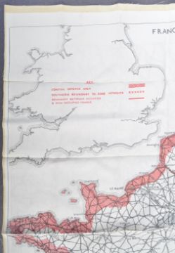 A WWII Second World War related silk ' escape ' map of France. Double sided. 1:2,350,000. Shows all main roads, canals and railways during the period as well as international boundaries . Undated, but appears to show c1941. Maps similar to this were smuggled into POW camps during WW2 by The Red Cross (acting on behalf of MI9 and the British Government). Measures approx; 43cm x 60cm.