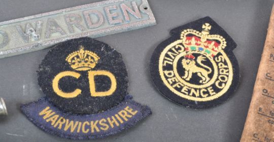 A collection of assorted WWII Second World War related ARP Air Raid Precautions items, to include; a rare original period LMS Railway Train ' Air Raid Precaution - DANGER ' paper sign in red and white, an original set of ' Anti Gas Eyeshields ', various armbands and patches, a small metal sign and a whistle. Interesting collection.