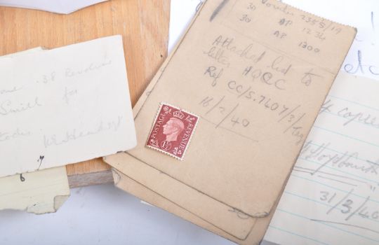 An original WWII Second World War RAF Royal Air Force uniform jacket, once belonging to one Pilot Officer Norman Alastair Lloyd Smith of 235 Squadron. The jacket bearing its original Austin Reed maker's label named to ' NAL Smith ' 32883 and dated 1938. The jacket retaining its original buttons and RAF Wings patch. Includes some related handwritten receipts which were discovered in the pocket, including a receipt for a .38 revolver, and various stationery (including Computer, Compass etc). Also includes some later research material, and a laminated information sheet from where the jacket was once on display, detailing Smith's career. Smith was pilot of Blenheim L9324 which was shot down into the Nieuwlandse Polder, Holland, on 12th May 1940. All the crew were killed. A poignant piece of uniform.