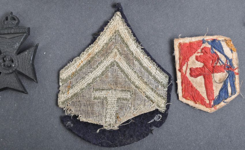 A collection of assorted WWII Second World War and other period military related items, to include; various cap badges, a Japanese cased compass, cloth patches, mother of pearl badge, uniform buttons and other items.