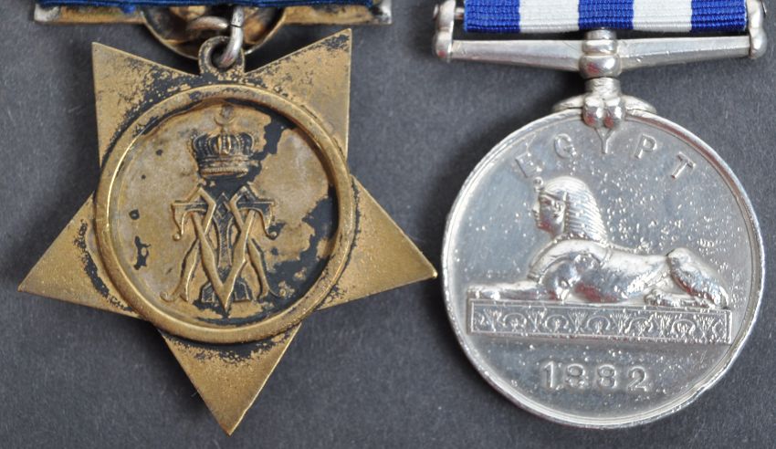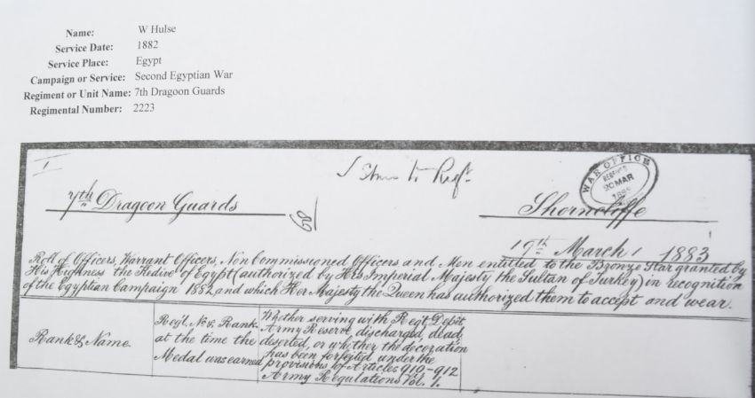 A 19th century Victorian Anglo-Egyptian War medal pair awarded to one 2223 Private W. Hulse of the 7th Dragoon Guards. The medal pair comprising his Egypt Medal (engraved 2223 Pte W. Hulse 7/Dn Gds) and his Khedive's Star. Both with ribbons. Supplied with the pair is a small selection of associated research and copied documents including Rolls, Lists and a brief history.