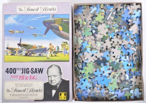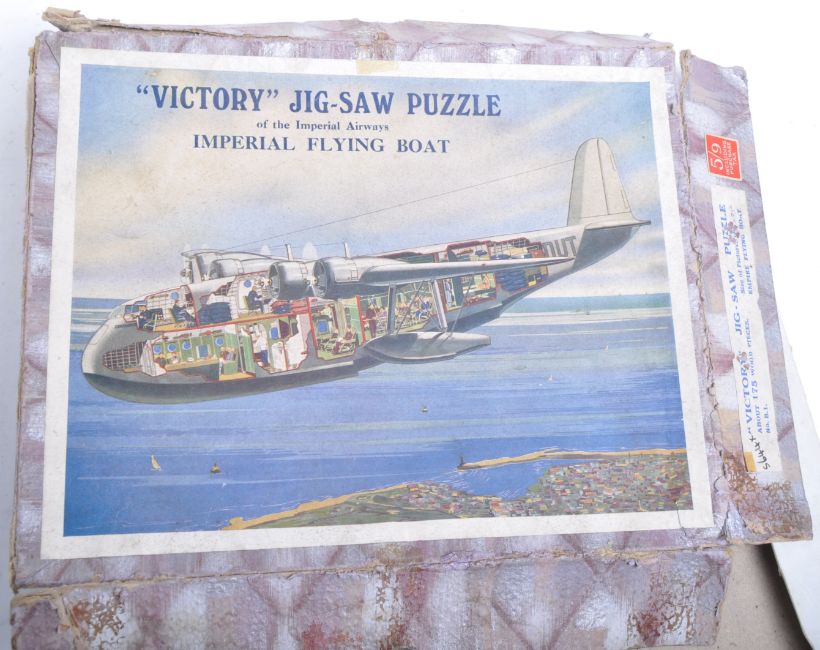 A collection of assorted WWII Second World War period military / aviation themed jigsaw puzzles, to include; a Victory Jig-Saw Puzzle of British Military Aircraft, Victory ' Imperial Flying Boat', AVN Jones puzzle ' Great New Flying Boats '. The British Military Aircraft puzzle being framed for display, and complete. Others unchecked.