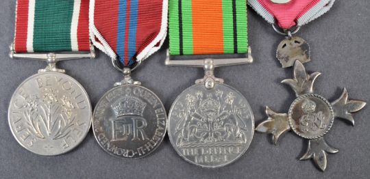 An original WWII Second World War British woman's medal group with accompanying minatures comprising an OBE, The Defence Medal, Queen Elizabeth II Coronation Medal and The Women's Voluntary Service Medal with a second award clasp. Medals belonging to an unnamed female, suspended on original ribbon with medal bar. Interesting collection