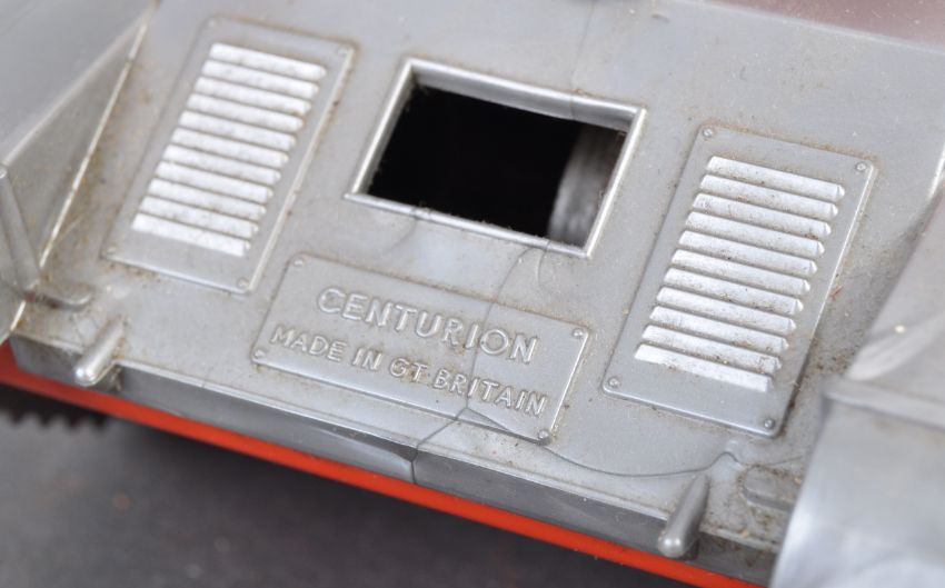 An original vintage British Made ' Friction Drive Centurion Tank ' No. 8205. Plastic construction, with a silver coloured body and red movable turret. The mechanism in working order (sparking action a little faint). Within its original box. No maker's name, but very similar to Marx Toys from the period. Great vintage toy military tank.