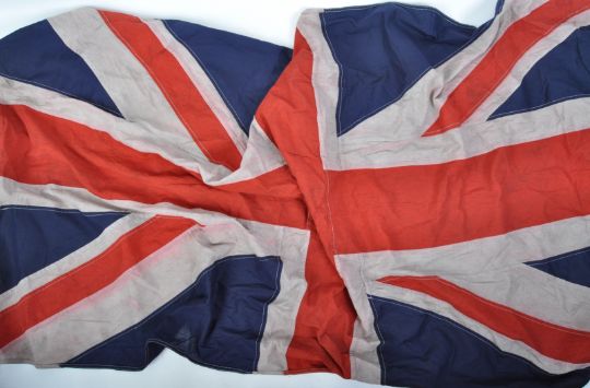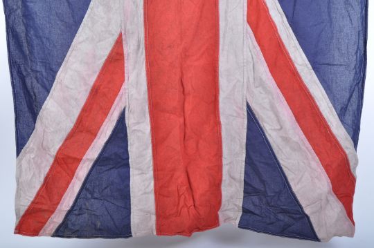 A WWII Second World War interest large Union Flag / Jack of typical form in red, white and blue. Complete with original rope to end. The seam erroneously stamped ' 3 Commando ' and dated 1943. Measures approx; 91cm x 163cm.