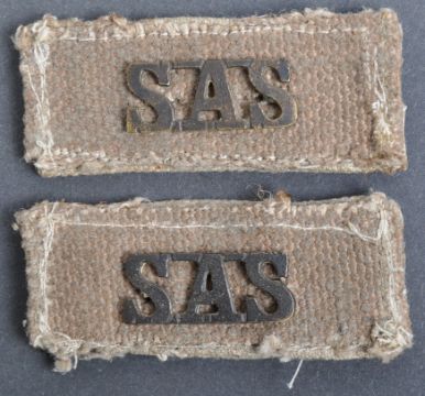 Two WWII Second World War type British Armed Forces SAS Special Air Service shoulder titles. Brass Theatre made SAS letters on a khaki / sand colour canvas webbing. Each to measure approx 6cm