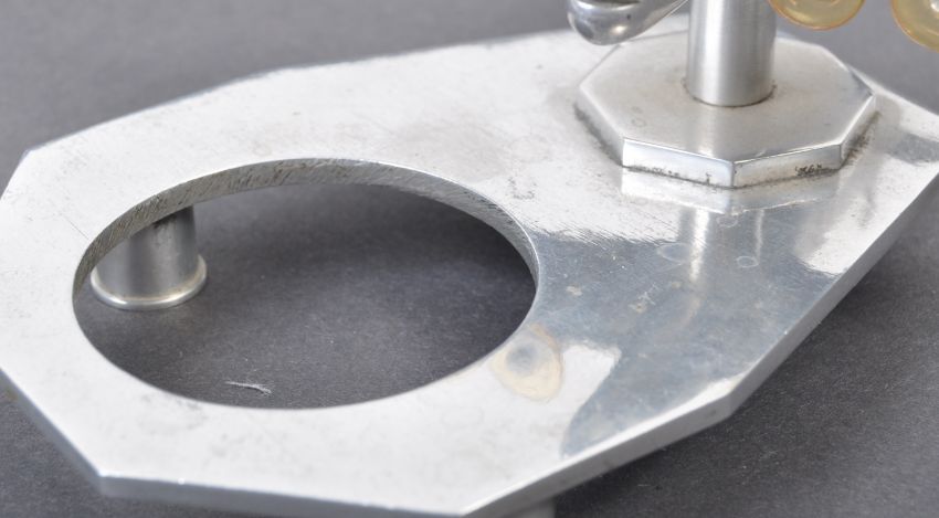 A WWII Second World War 1940s desktop model of an RAF Sterling bomber. Well made polished aluminium metal model, with RAF Roundels to each wing, and with Perspex propeller sections. Mounted on a shaped base with a mount likely for an inkwell or similar. Measures approx; 7.5cm tall.