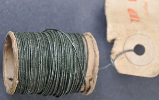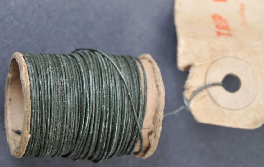 A WWII Second World War MI9 / SOE related unused reel of trip wire. The small reel of green wire (for camouflage purposes) retains the original label which reads ' Trip Wire - Important - Run Wire Through Finger And Thumb To Remove Kinks Before Use '. Rare.