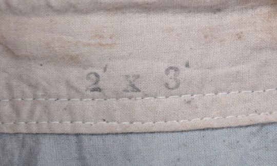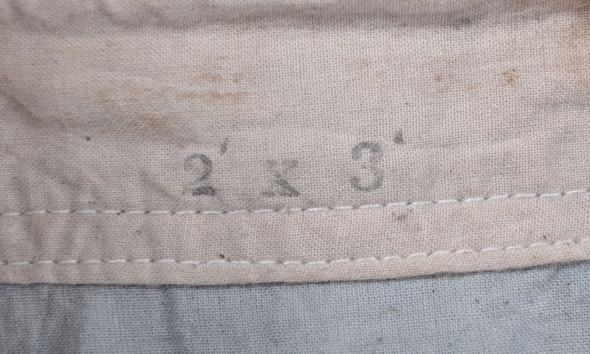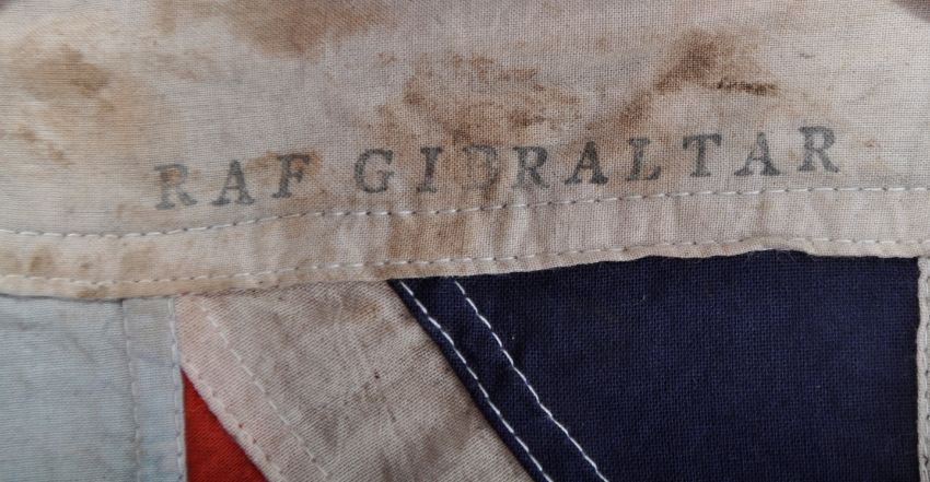 An original vintage WWII Second World War period RAF Royal Air Force airfield / building flag / ensign. Typical form, with blue ground, RAF Roundel to end and Union Flag to corner. The seam erroneously stamped with ' RAF Gibraltar ' and dated 1943. Exact age or provenance is unknown, but the flag is likely a genuine period example, with later markings. Measures approx; 64cm x 99cm.