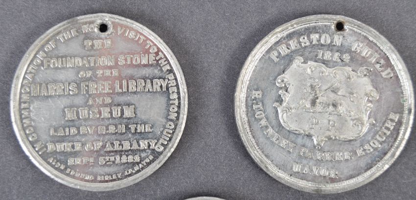 Collection of antique medallions - x5 antique Victorian white metal medallions of Preston and Preston Guild Merchant interest. The collection to include an 1842 medal in Commemoration Of The Jubilee At Preston, 1862 Commemorative medal depicting Preston Town Hall, 1875 Preston Exhibition medal, 1882 Commemorative medal celebrating the Royal visit of the Duke and Duchess of Albany to Preston and a 1902 Commemoration of the Guild Merchants medal. Combined gross weight; 115.5g