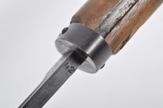 An original WWII Second World War period Czech (under Nazi German occupation) made Mauser rifle bayonet. The bayonet with wooden shaped grips, eagle formed pommel with push-stud release, short quillon, leading to a single edged fullered blade. The ricasso stamped ' dot ' with numbers to other side. Made in the Brund factory. Within its original steel scabbard. Total length approx; 50cm.