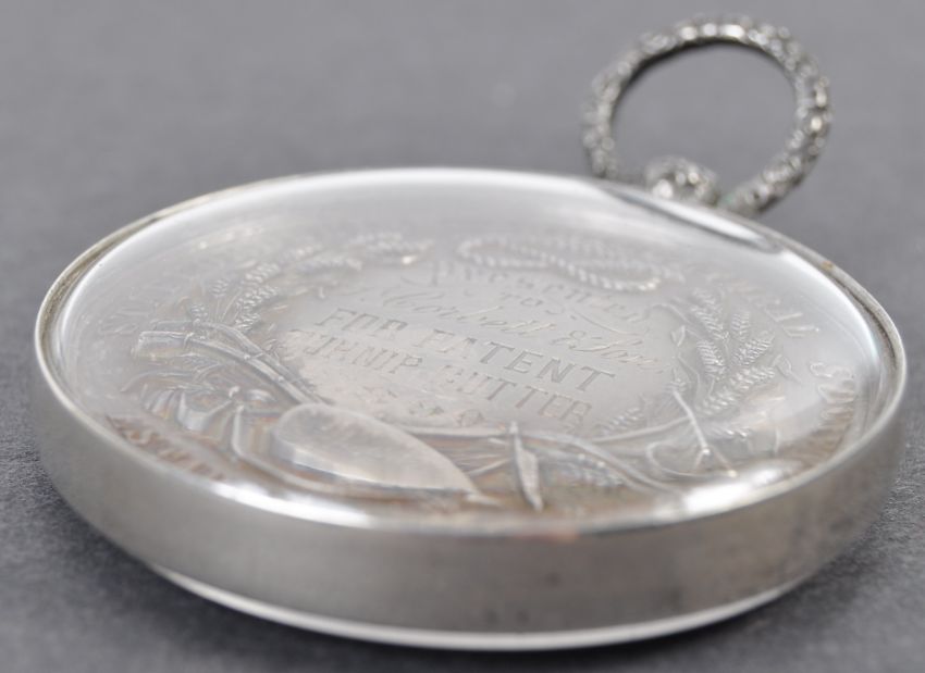 Collection of antique medallions - an antique Victorian believed silver 1890 medallion from Staffordshire Agricultural Society awarded to ' L. Corbett & Son for Patent Turnip Cutter - 1890 '. Set within a glass case with white metal surround. The front of the medal beautifully decorated with Farm animals, with makers marks for Ottley of Birmingham. No visible hallmarks. Diameter: 4.8cm Gross Weight; 55.6g