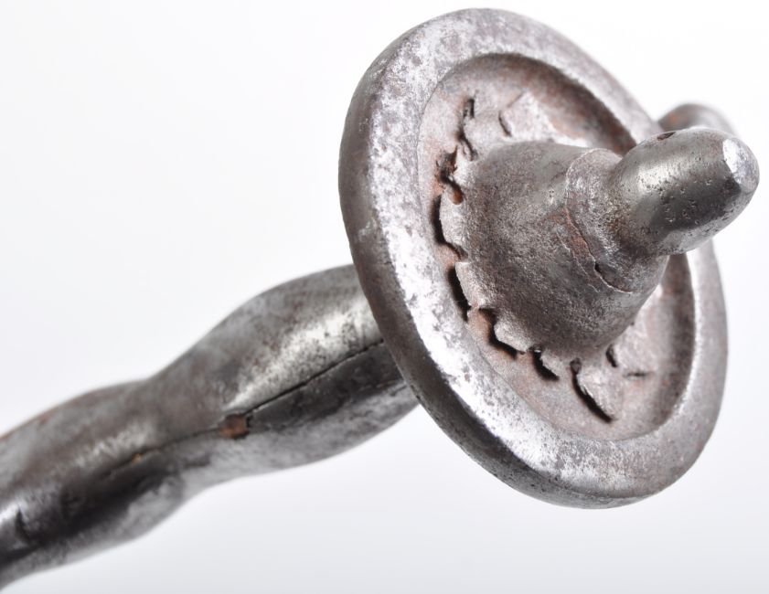 An early 19th Century antique Indian Kirach / Tulwar ( Talwaar / Talwar ) sword. The metal sword having a disk shaped pommel, knuckle guard, cross shaped quillon and a singled edged curved blade. Measures approx 94cm.