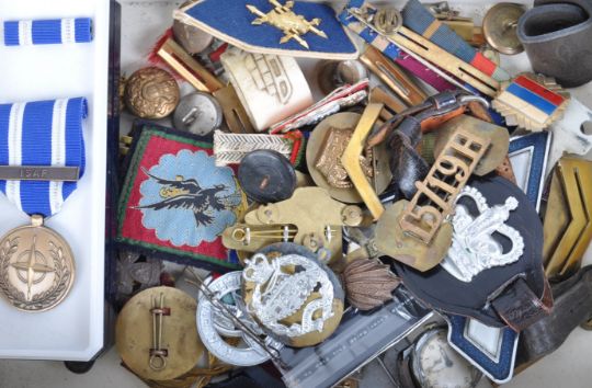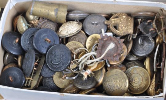 A large collection of assorted WWI First World War, WWII Second World War and related Military items to include cap badges, cloth patches, uniform buttons, hackles, medal bars and other interesting pieces. Regiment examples to include Air Training Corps, Royal Artillery, Royal Hussars, British Red Cross Society and many more. Interesting assortment