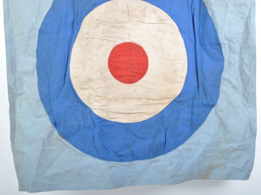 An original vintage WWII Second World War interest (possibly just post-War issue) RAF Royal Air Force Ensign flag. Typical form, in blue with Union Flag to corner and RAF Roundel to edge. The seam undated, but faintly stamped with RAF markings. Heavy linen construction. Measures approx; 71x150cm.
