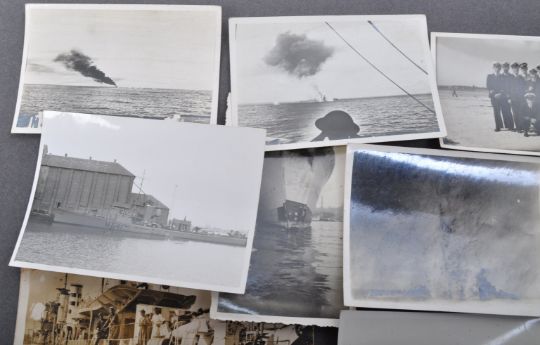 A collection of assorted WWII Second World War Royal Navy photographs - all presumed to be related - most notably containing several photographs of a battleships being sunk / attacked. The photos shop several ships on fire, being hit by explosions and similar. Other photographs taken on board a British vessel, two showing the rescue of a submarine (possibly gathering survivors from a German submarine). Most 7x10cm, some other sizes. An interesting collection, from an unknown serviceman.