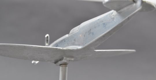 A WWII Second World War interest mid-20th century polished steel / aluminium model of a Battle Of Britain Spitfire. The model with propeller and mounted on a rounded base. Measures approx; 6" tall.