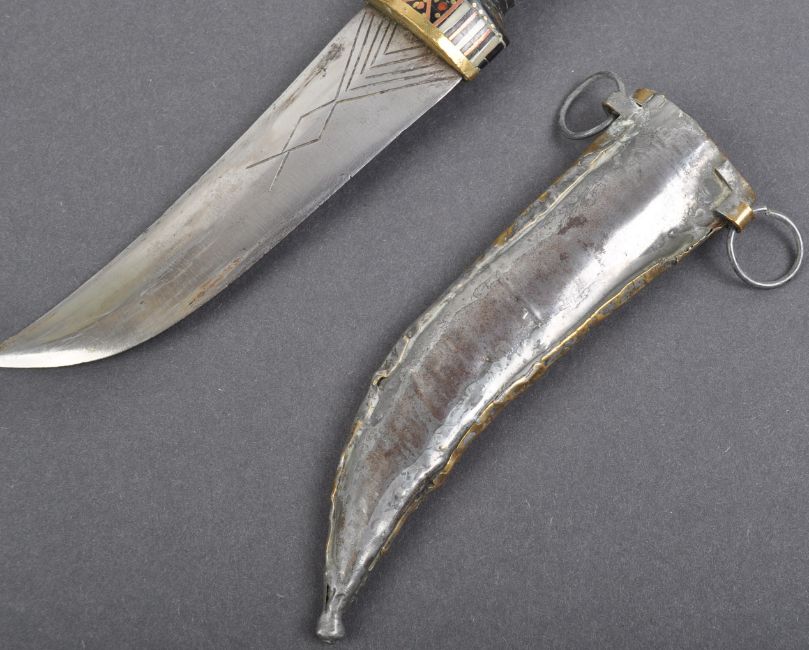 An antique late 19th / early 20th century Islamic / Arabic Jambiya dagger. The handle profusely decorated with brass and bone inlay. Housed within its original brass scabbard. The blade being single edged, with etched decoration. Measures approx; 27cm long.