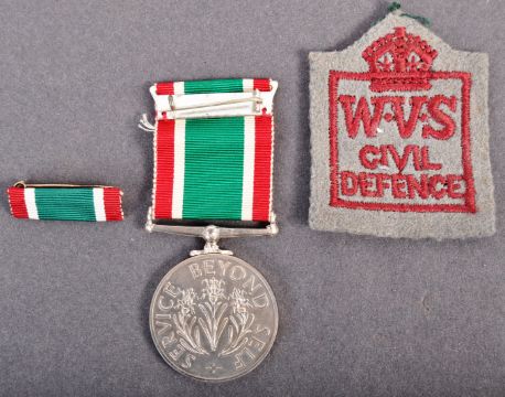 An original post-WWII Second World War related WVS Women's Voluntary Service cased medal awarded to one C. E. Rowley. Along with a cloth Civil Defence WVS uniform patch. Within its original box, with ribbon.