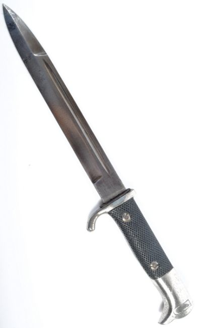An original WWII Second World War Third Reich German Nazi short KS98 Kurzes Seitengewehr rifle bayonet having chequered grips, steel hooked pommel with press release stud, front facing quillon, fullered single edged blade etched with ' Zur Erinnerung an Meine Dienstzeit '. No makers marks. Within its original steel scabbard. Measures approx; 35cm long in total.