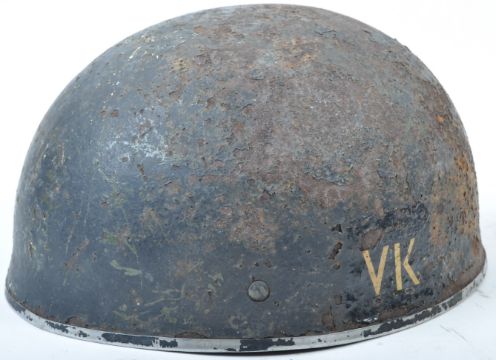 An original WWII Second World War 1944 dated British Airborne / Paratrooper steel combat uniform helmet. Complete example - retaining the original leather liner, canvas chin strap, and original foam padding. The liner stamped ' BMB ' and dated 1944. The shell retaining some original black paint, with a ' VK ' unit flash to one side.