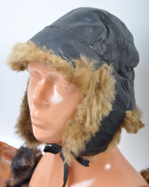 A collection of x5 assorted aviation flying helmet / motorcycle / automotive helmets comprising x3 Charles Markson made black leather examples being wool lined with peak and ear protectors, x1 unmarked brown leather example lined with presumed rabbit fur, chin strap and removable ear protector flaps and a black leather leather peaked hat with chin protector. Interesting assortment
