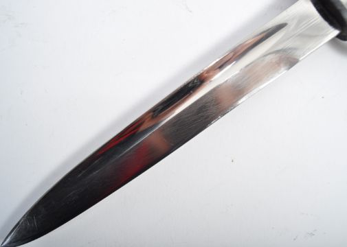 An original WWII Second World War German Nazi Third Reich short KS98 Kurzes Seitengewehr rifle bayonet - Police or Fire Service NCO shorter pattern. Having chequered grips, steel hooked pommel with press release stud, recurved quillons, no rifle slot, fullered single edged blade. No maker's marks. Within its original steel scabbard. Measures approx; 35cm
