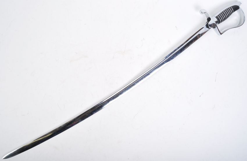 An interesting 20th Century re-enactment GDR East German Army parade sword. The sword having nut to the pommel, polished chrome hilt and a leather and wire bound handle. Forward facing quillon to the cross guard and and a long fullered blade. Measures approx 97cm.