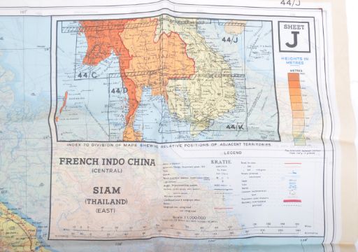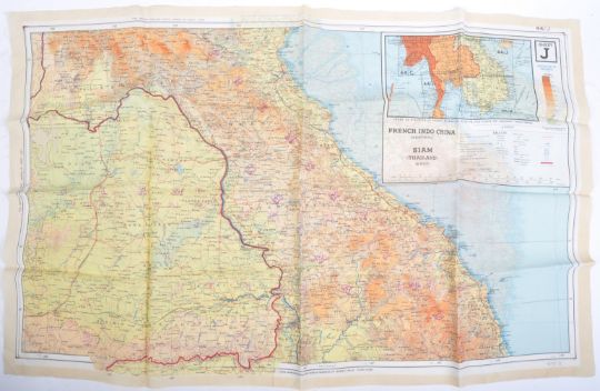 A WWII Second World War British RAF / Military silk escape Map, 1944. South-east Asia sheets 44 J and K. Two back-to-back escape maps on one folding silk map. Size 95 by 60 cm. Scale 1:000,000. Folds to pocket handkerchief size or smaller. Side J covers French Indo-China (central), Siam (Thailand east) and side K covers an area of French Indo-China (south), Siam (Thailand- part). Maps are in colour with a colour-coded key to heights and a conventional key to features such as mountains, islands, railways, stations, ruins, post offices, roads etc.