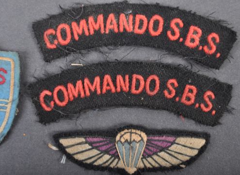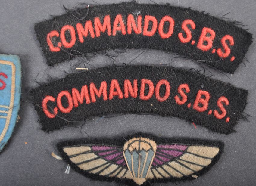 WWII Second World War Interest - a collection of x4 ' Commando ' related cloth uniform titles. Including x3 ' SBS ' Special Boat Service patches. Age unknown, likely re-enactment.