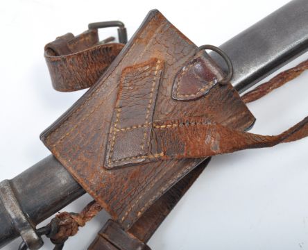 A 19th Century antique 1857 pattern British Infantry ' Engineers Volunteer ' sword. The sword having a chequered pommel, brass half-basket guard and wire wrapped texture grip. The long fullered blade etched with scrollwork motifs and the words ' Engineers Volunteer '. Housed in a steel scabbard with leather holster. Measures approx 98cm