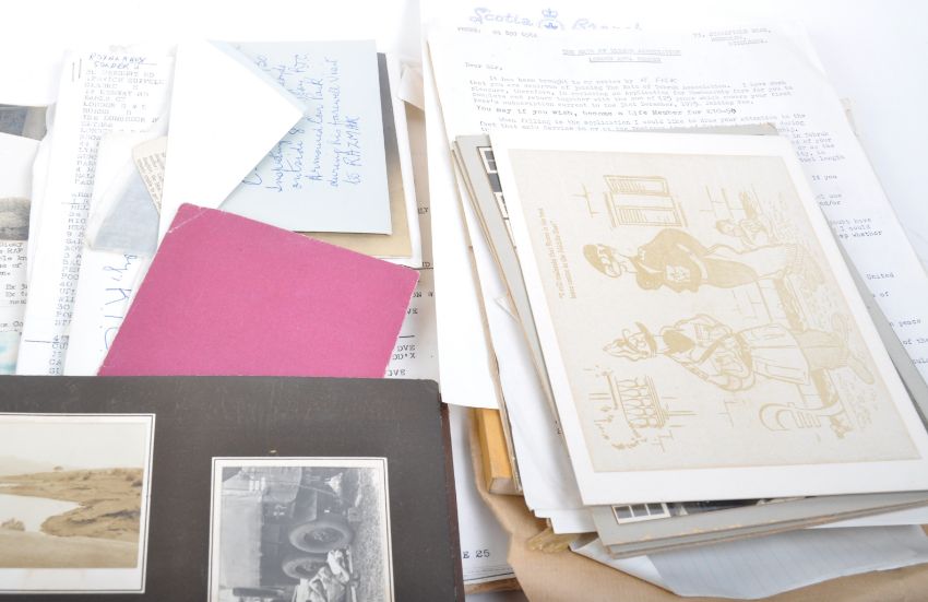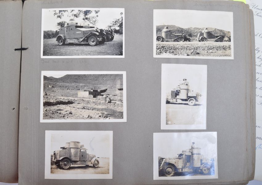 The effects of one Major John Gordon Stephens - A fascinating large archive of inter-war 1920s / 1930s period Royal Tank Regiment and Royal Armoured Corps based in India, related ephemera and photographs, all as taken by or kept by Major Stephens. The archive comprising of x4 albums of period photographs all taken by or including Stephens. the first album (faux crocodile skin) contains photographs of Armoured cars entering Delhi fort, the Taj Mahal, Imperial Airways plane, Fort Delhi, soldiers marching on Shingi bridge, Ferries, and others. The second album (black) containing more personal images including Stephens in uniform, family, vehicles, gatherings, vehicle accidents, unusual armoured vehicles, excursions, and other such views. The third album (brown) containing just a few images, including several of early RAF aircraft, views in England, more armoured vehicles etc. The fourth and final album (long black) contains Indian views, pictures of locals etc. The collection also contains a large folder of related paperwork including Stephens' Commendation for promotion to Second Lieutenant in 1923, a larger sized regimental photograph ' Royal Tank Corps Depot Boxing Team 1936 ' showing Capt Stephens, various loose photographs, a certificate for a mention in Despatches for Distinguished Service, various letters to Stephens from colleagues (including some mentioning his photographs), a handwritten memoir ' Some Memories Of My Year In Waziristan ' (which follows along with many of the photographs). A fascinating and important collection.