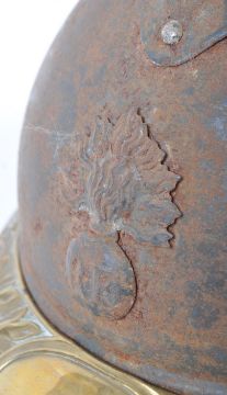An original WWI First World War M15 French army ' Adrian ' steel combat helmet. Complete example, including the original liner, chin strap, ' RF ' badge to front and comb to top. Remnants of original paint present. Supplied with a related but original ' Soldat De La Grande Guerre ' (Soldier Of The Great War) pressed brass helmet plate, for fixing to the front brim (worn after the war by veterans of the French army).