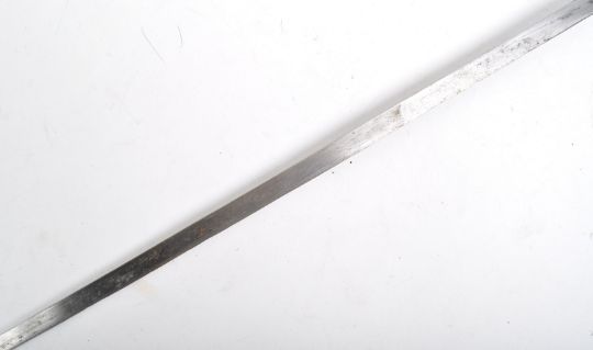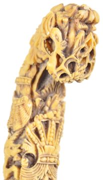 A 19th Century Victorian gentleman's sword stick / walking cane with concealed blade. The cane having an intricately carved bone handle appearing to depict East Asian dragons and other mythical creatures. A brass geometric engraved collar leading to a single edged stiletto blade housed in a hardwood sheath. Measures approx 91cm.