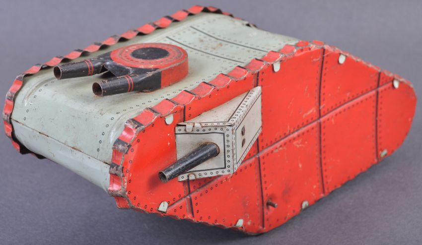 An antique German made clockwork tinplate model of a WWI First World War British tank. The tank with clockwork mechanism driving two tinplate wheels (working order). The tank marked ' Made In Germany ' to rear, with a fixed key mechanism. Measures approx; 26cm long. AF - a hatch appears to be missing to the rear.