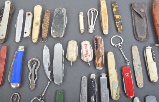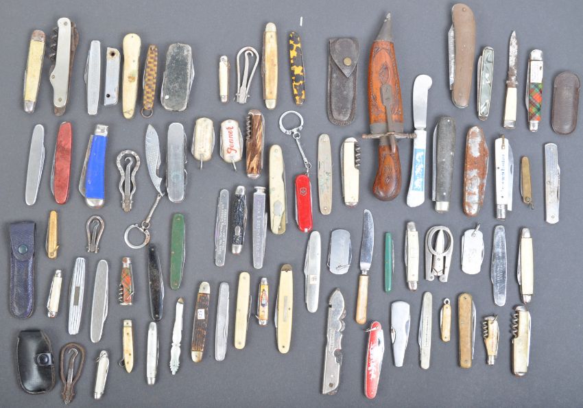 A large collection of assorted 20th century penknives / knives and other related items, to include several stainless steel examples, pocket knives, a wooden cased knife, faux mother of pearl knives, folding fruit knives and others.