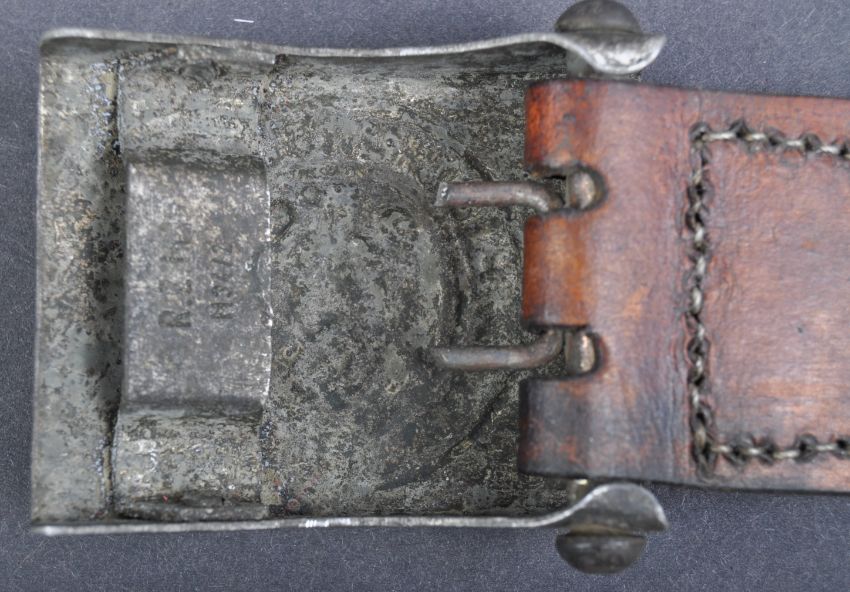 An original WWII Second World War Third Reich Nazi German ' Hitler Youth ' belt buckle. The buckle depicting the Nazi eagle and Swastika to the centre. RZM stamp to the reverse. Still retaining part of the original leather belt. Good example.