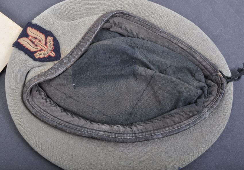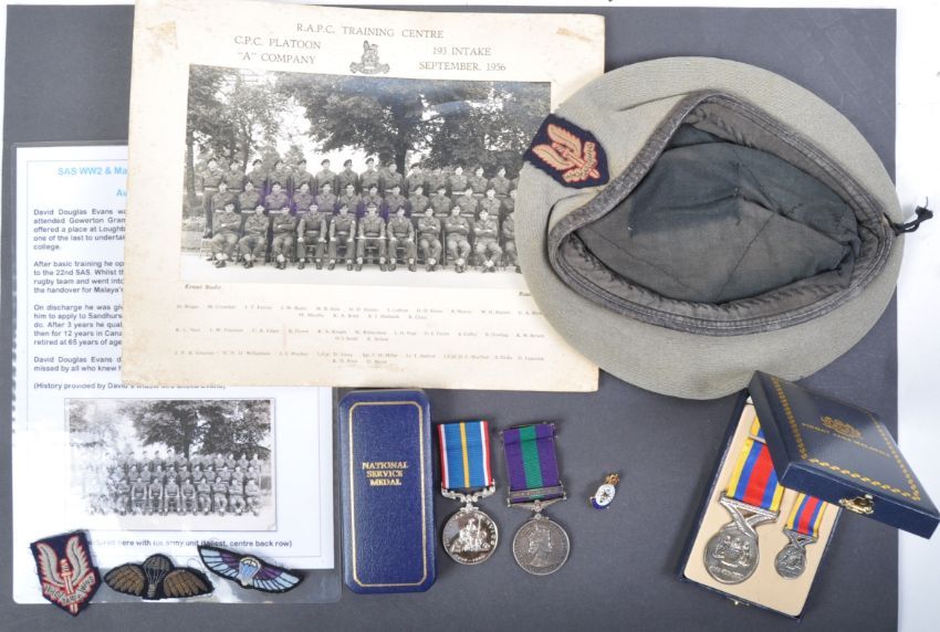 A WWII Second World War medal group and collection of effects relating to one 23328503 Private David Douglas Evans of the Royal Army Pay Corps, later attached to 22nd SAS. The medal group comprising his National Service Medal, and his Malaysian Service Medal both within the original boxes, and his (incorrectly named) General Service Medal (impressed 23328503 Pte D.D. Edwards RAPC (incorrectly named Edwards instead of Evans). Along with the collection comes a small collection of personal effects including a RAPC Training Centre photograph from 1956 showing Evans, his Discharge Booklet which shows his ' Basic Parachutist ' training and is stamped to the rear ' 22 SAS Regiment ', two real photographic postcards (one showing Evans in uniform, taken at an overseas photography studio), a post-war uniform beret with patch and two SAS related cap badges. An interesting group and collection. Was once on display and features the original information card which details Evans' life and military career, the information given by his Widow.