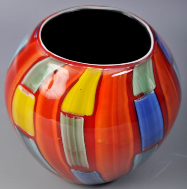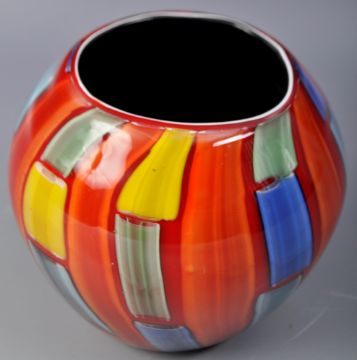 Seguso - Murano - Fireworks - A retro vintage late 20th Century Italian Venetian studio art glass vase of small globular form with a red / orange ground with blue, yellow & green squares throughout. Measures approx; 11cm tall.