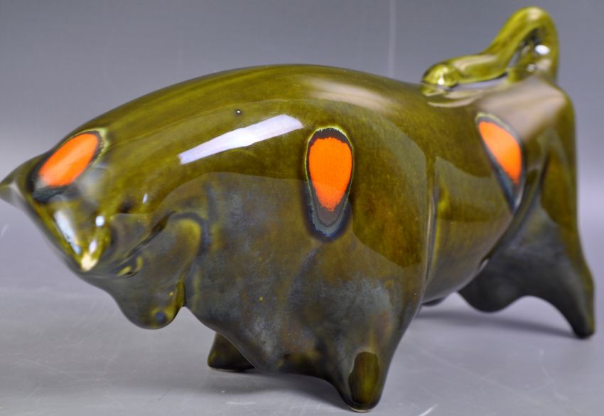 Colin Melbourne - Trentham Pottery - an original retro vintage mid 20th Century ceramic bull of stylised form in green glaze, with orange spots. No visible cracks, chips, or repairs present. Measures approx; 29cm long.