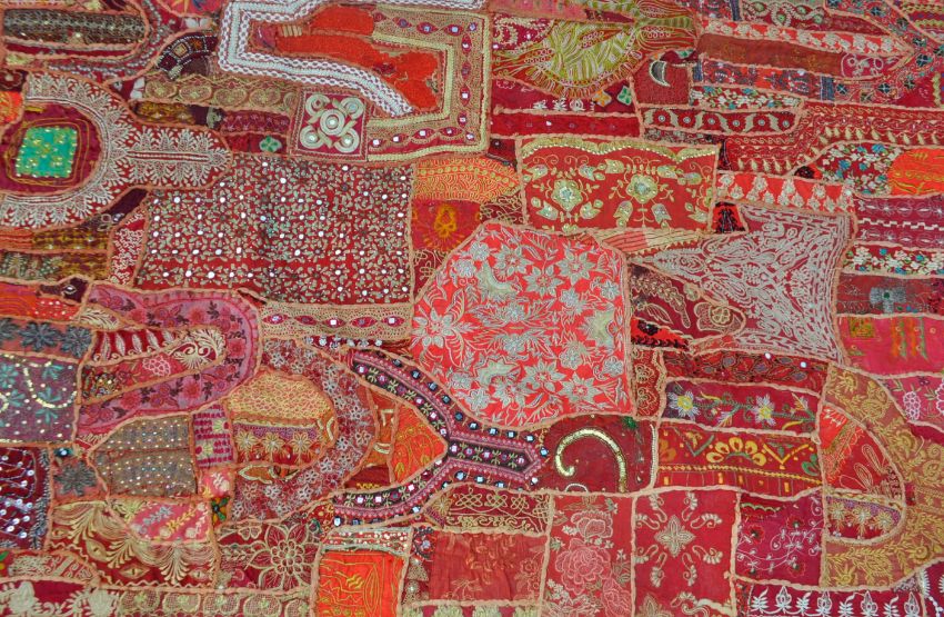 A retro vintage 20th Century Indian throw / wall hanging being constructed from multiple Indian ceremonial / wedding dresses. Fantastic patterns and details featuring an array of geometric and floral designs / colours. Measures approx; 250CM X 200CM Roughly.