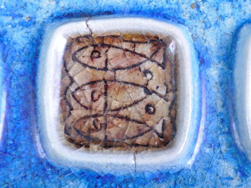 Aldo Londi - Bitossi - Fish Pattern - An original retro vintage 1960's Italian studio art pottery lidded box having three medallions on the front Rimini  blue panel, each decorated with an incised double fish motif under a crackled fritte glaze in a mustard yellow. The back, sides and stepped top are glazed in a mottled mustard yellow. Stamped to underside Italy. A rare example. Condition; six chips to underside of lid, minor chip present to base on some corners. Overall a good example.