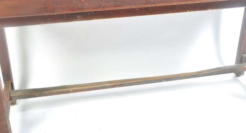 A large and impressive vintage antique early 20th Century English mahogany double clerk's desk / accounts desk of elongated rectangular form. The removable sloped top having twin lift up writing compartments with all being raised on straight leg supports united by a single central stretcher. Measures approx 114cm x 212cm x 73cm.